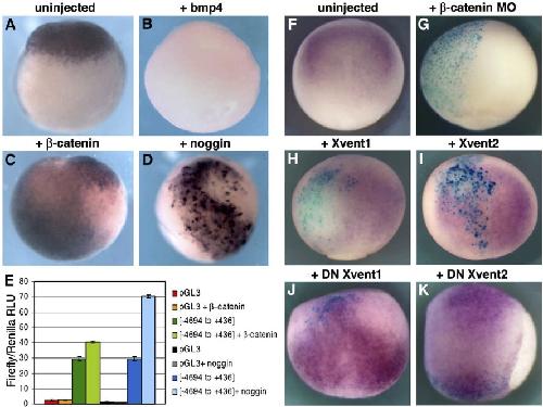 Fig. 6. geminin regulatory sequences respond to the Wnt and BMP signaling pathways in the gastrula embryo. (A D) In situ hybridization for eGFP in embryos transgenic for [-4694 to +436] plasmid. Animal hemisphere views of late gastrula embryos (st. 12), dorsal up. Embryos were injected in one cell at the two cell stage (left bilateral half in the images shown) with bmp4 (B), beta-catenin (C), or noggin (D) mRNA. (A) shows an uninjected sibling embryo. (E) Luciferase assays of embryos injected with pGL3basic or this vector containing 5.1 kb of geminin 5V regulatory sequences. Samples were co-injected with mRNAs as indicated. Normalized values (Firefly to Renilla) for three pools of embryos per sample were averaged. Representative results are shown. Error bars represent standard errors. (F) In situ hybridization for Xgem at st. 11.5. (F) Dorsal views with posterior down. (K) Side view with posterior to the right and dorsal up. (F) uninjected embryo (G) Injected with beta-catenin morpholino oligonucleotide into 1 cell at the 2-cell stage. (H K) Injected with mRNA for Xvent1 (H), Xvent2 (I), VPXvent-1 (J), or VPXvent-2 (K) into one A-tier blastomere at the 32-cell stage. (G K) Blue X-gal staining indicates site of injection. (B D and G) mRNA delivery was not restricted to a small ectodermal domain, and axial patterning of the injected embryos was broadly affected.
