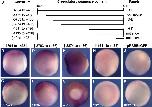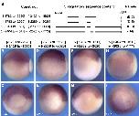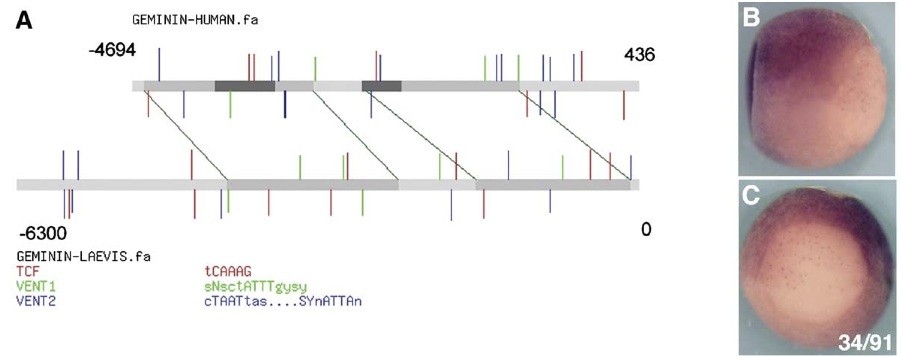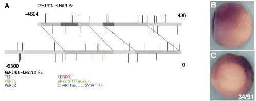 Fig. 7. Conservation of Regulatory Domains. (A) The 5.1 kb of hgem 5V sequence is aligned to 6300 bp of Xgem 5V sequence using WU-BLAST (http:// blast.wustl.edu) (parameters: W = 5, M = 5, N = 3, Q = 10, R = 10). Sequences are represented by gray bars. In hgem, the two regulatory domains are represented by dark gray bars. Aligned sequences between hgem and Xgem are represented by medium-gray bars and linked by green lines marking the ends of the alignments. Putative binding sites for Tcf, XVent1 and XVent2 are labeled by red, green and blue vertical lines, respectively. These putative sites are determined by scanning both sequences against scoring matrices of these transcription factors using the program PATSER (http://ural.wustl.edu) and using cutoff values determined by the program. Locations of lines (above or below the sequences) indicate the orientation of the sites (on forward or reverse strand respectively). Lengths of lines are proportional to the scores of the sites which indicate the strength of the sites. (B, C) Transgenic embryos carrying 5 kb of upstream sequence from Xgem cloned into pRAREeGFP were analyzed at st 11.5 by in situ hybridization for eGFP. (B) side view with posterior to the right and dorsal up. (C) posterior view with dorsal up. Numbers indicate sequence location relative to the transcription start site.