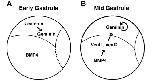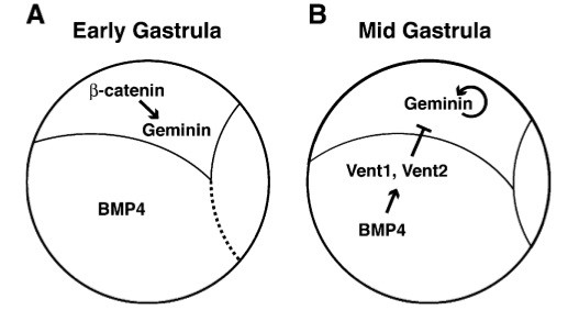 Fig. 8. Model of regulation of early geminin expression. (A) Early gastrula:. Nuclear-localized Beta-catenin is active dorsally. Our data demonstrates that Beta-catenin can activate Xgem and the geminin 5V sequences and that Tcf sites in the geminin regulatory sequences are necessary for geminin expression in dorsal ectoderm at early gastrulation. (B) Mid gastrula: geminin can activate its own transcription. BMP4 activates the transcriptional repressors XVent1 and XVent2. Our data demonstrates that XVent1 and XVent2 sites in the geminin regulatory sequences are necessary to restrict geminin expression to dorsal tissues at mid-gastrulation. We also found that Xgem or geminin regulatory sequences responded negatively to BMP signaling. Schematics are side views of st. 10.5 (A) and st. 11.5 (B) Xenopus gastrulae with posterior facing right and dorsal up.