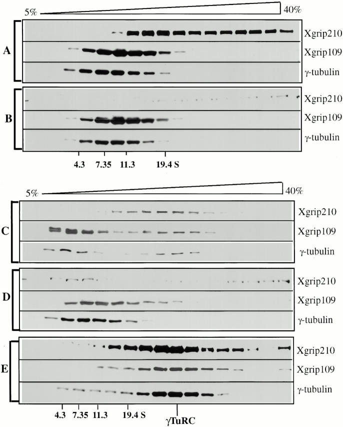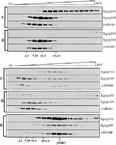 Figure 8. Xgrip210 is required for γTuRC assembly. The γTuRC present in 30% ASP was dissociated by Hepes 1M and immunodepleted with either random IgG (A) or Xgrip210 antibody (B) followed by analysis on 5–40% continuous sucrose gradients made in Hepes 100. Alternatively, after immunodepletion, salt concentrations were reduced by passing the immunodepleted mixtures through desalting columns equilibrated with Hepes 100, and then analyzed by sucrose gradient sedimentation (C and D). Random IgG depletion allowed the reassembly of a fraction of the Xgrip210, Xgrip109, and γ-tubulin into the γTuRC-size complex (C), whereas immunodepleting Xgrip210 completely blocked reassembly (D). (E) 30% ASP was resuspended in Hepes 100 and fractionated on identical sucrose gradients as a control. All gradient fractions were analyzed by Western blot, probing with antibodies against Xgrips210 or 109, or γ-tubulin. The intact γTuRC in E migrated to the same position as that of the reassembled γTuRC shown in C. Protein standards used (S values indicated) were the same as described in Fig. 3 C.
