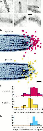 Figure 4. Immunogold localization of Xgrip210. (A) Examples of MTs with single 10-nm anti–Xgrip210 gold particles at the MT ends capped by γTuRC. In all cases shown, the center of the gold particle was within 15 nm of the tip of the end cap. Scale bar: 50 nm. (B) Distribution of anti–Xgrip210 or anti–γ-tubulin gold particles superimposed on an image of a typical γTuRC-capped MT end. Scale bar: 10 nm. (C) Distance distribution of the gold particles to the base of the MT lattice (dashed line), measured along the long axis of the MTs (red, Xgrip210; yellow, γ-tubulin). The average distance of the anti–Xgrip210 and anti–γ-tubulin gold particles from the base of the MT end are 10.4 ± 8.8 nm (n = 69) for Xgrip210 and 3.7 ± 9.9 nm (n = 39; Keating and Borisy 2000) for γ-tubulin. (D) Distribution of lengths of the microtubule end cap measured from the end of the microtubule lattice (B, dashed line) to the tip, from a representative sample of microtubules. The average length of the cap was 14.3 ± 3.7 nm (n = 33).
