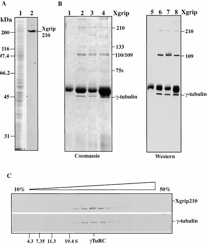 Figure 2. Xgrip210 is a component of Xenopus γTuRC. (A) Crude Xenopus egg extracts were analyzed by Coomassie blue staining (1) or by Western blot, probing with anti–Xgrip210 antibodies (2). The antibodies specifically recognized a protein of the expected size for Xgrip210. (B) Random rabbit IgG (1 and 5) and antibodies against Xgrips210 (2 and 6) or 109 (3 and 7) or γ-tubulin (4 and 8) were used to immunoprecipitate the respective proteins from Xenopus egg extracts. The immunoprecipitates were analyzed by SDS-PAGE followed by Coomassie blue staining (1–4) or Western blot, probing with each of these antibodies (5–8). All three antibodies immunoprecipitated the same γTuRC subunits. Although the Xgrip210 antibody specifically recognized Xgrip210 in the egg extracts (A, 2), the antibody recognized several high molecular weight proteins in the Xgrip210 immunoprecipitate (B, 8). The nature of these cross-reactive proteins is currently unknown. (C) Clarified Xenopus egg extract or protein standards with S values of 4.3 S (bovine serum albumin), 7.35 S (rabbit muscle aldolase), 11.3 S (bovine liver catalase), and 19.4 S (porcine thyroglobulin) were run on parallel 10–50% sucrose gradients. The fractions were analyzed by Western blot, probing for γ-tubulin or Xgrip210 or by Coomassie blue staining for the protein standards.