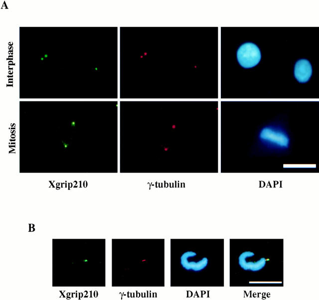 Figure 3. Xgrip210 colocalizes with γ-tubulin at the centrosome. (A) Immunofluorescence staining of Xenopus tissue culture cells with antibodies against Xenopus γ-tubulin and Xgrip210. (B) Immunofluorescence staining of Xenopus sperm centrosomes with antibodies against Xenopus γ-tubulin and Xgrip210. Nuclear DNA in A and B was stained by DAPI. Scale bars: 20 μm.