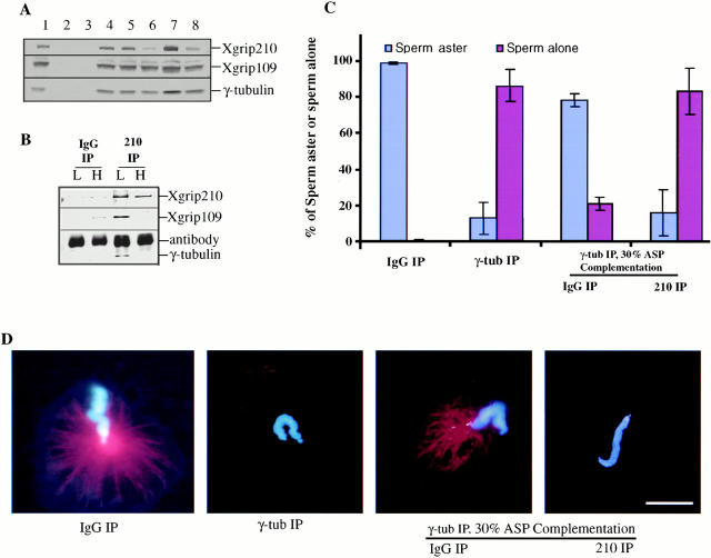 Figure 5. Immunodepletion of Xgrip210 inhibits sperm centrosome formation. (A) Western blot analysis of immunodepleted egg extracts and 30% ammonium sulfate fractions. Xenopus egg extract immunodepleted with either random IgG (1) or antibodies against Xenopus γ-tubulin (2). 30% ammonium sulfate supernatant (3) and pellet (4). 30% ammonium sulfate pellet (30% ASP) resuspended in Hepes 1M and immunodepleted with either random IgG (5) or antibodies against Xgrip210 (6). 7 and 8 are the same as 5 and 6, respectively, except that the proteins were desalted into Hepes 100 and concentrated ∼10-fold. (B) Immunoprecipitates of random IgG (IgG IP) and Xgrip210 antibody (210 IP) from high (H) or low (L) salt-treated 30% ASP were analyzed by Western blot, probing with antibodies against Xgrips210 or 109, or γ-tubulin. Xgrip210 antibody did not immunoprecipitate significant amounts of Xgrip109 or γ-tubulin in high salt conditions. (C) The blue and red columns represent the percentages of sperm with or without associated MT asters, respectively. Immunodepletion of the egg extract with random IgG did not inhibit the formation of sperm centrosomes (IgG IP). The inhibition of sperm aster formation by immunodepleting γ-tubulin (γ-tub IP) was relieved by complementing with the 30% ASP that was depleted with random IgG (IgG IP), but not by the 30% ASP that was depleted with antibodies against Xgrip210 (210 IP). Error bars represent standard deviations calculated from three independent experiments. (D) Representative sperm nuclei with or without a MT aster from the assays in C are shown. Scale bar: 20 μm. The MTs were labeled by inclusion of a small amount of rhodamine-tubulin in the assays, and the sperm DNA was stained with DAPI.