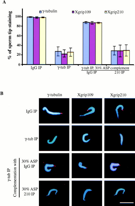 Figure 6. Immunodepleting Xgrip210 inhibits the recruitment of Xgrip109 and γ-tubulin to the sperm centrioles. (A) Blue, red, and yellow columns represent the percentage of sperm tips having γ-tubulin, Xgrip109, or Xgrip210 staining, respectively. Immunodepletion of γ-tubulin from Xenopus egg extracts (γ-tub IP) resulted in ∼70% reduction of the recruitment of γ-tubulin, Xgrip109, or Xgrip210 to the sperm tips, while the same treatment with random IgG (IgG IP) had no effect. Complementing the γ-tubulin–depleted egg extract with the 30% ASP immunodepleted with random IgG (IgG IP) restored the localization of γ-tubulin, Xgrip109, and Xgrip210 to the sperm tips, while the same treatment with anti–Xgrip210 antibodies (210 IP) had no effect. Error bars: standard deviations calculated from three independent experiments. (B) Merged images of sperm incubated in extract immunodepleted with either random IgG (IgG IP) or anti–γ-tubulin antibodies (γ-tub IP), and γ-tubulin–depleted extract complemented with either mock-depleted (30% ASP IgG IP) or Xgrip210-depleted (30% ASP 210 IP) 30% ASP. The images were pseudocolored. Sperm DNA was stained with DAPI and merged with the antibody staining of the sperm tip. In cases where the images appear to be similar, it is due to double labeling of γ-tubulin (mouse monoclonal antibody; Sigma-Aldrich) and Xgrip210 (rabbit polyclonal antibodies). Scale bar: 20 μm.