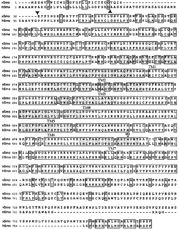 Xenopus (x) and human Smo. Identity between amino acids in the