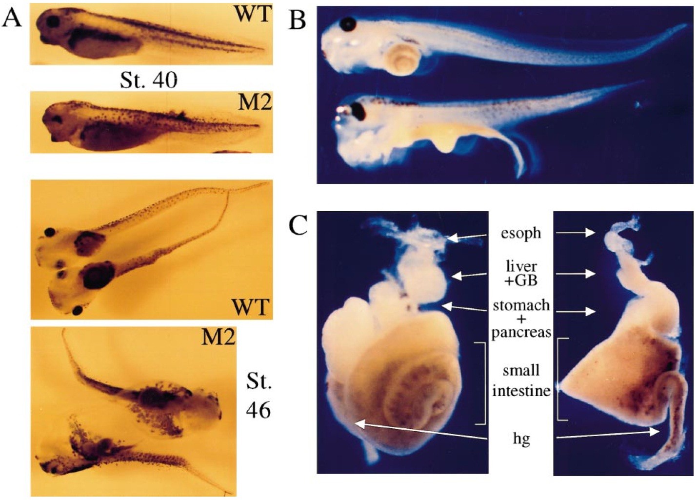 FIG. 3. Gross phenotype and abnormal intestine of tadpoles expressing SmoM2. (A) At NieuwkoopâFaber Stage 40 (top two images),