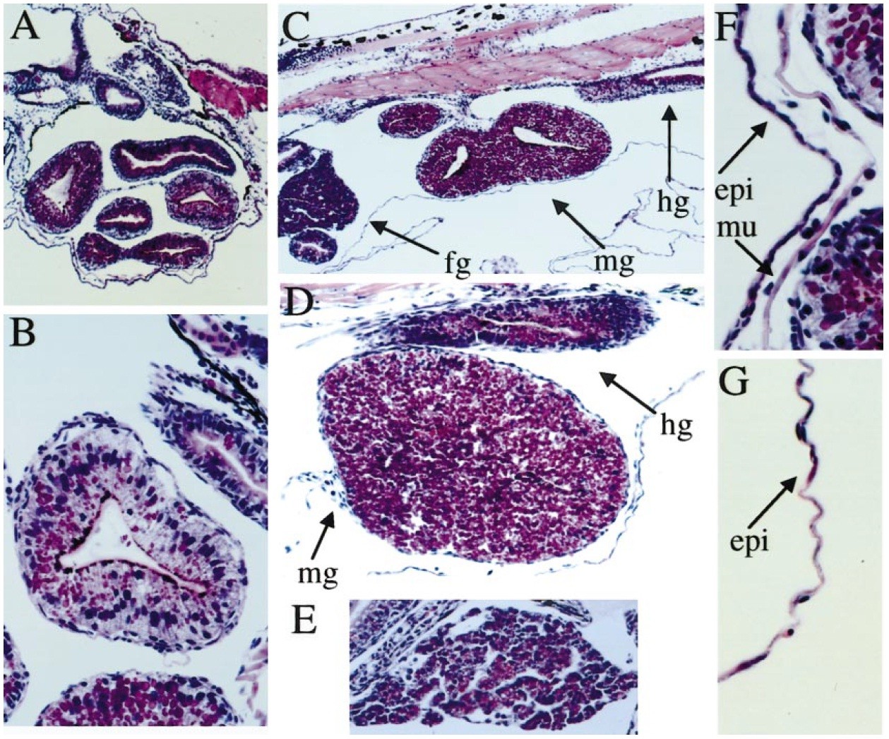 embryos (C) show a virtually linear arrangement of foregut (fg), midgut (mg) and hindgut (hg) derivatives. In contrast to the mature intestinal