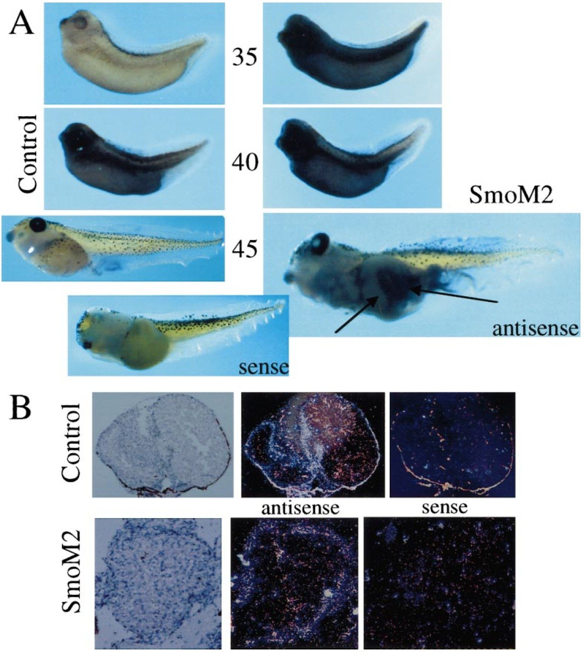 of uninjected (left) and SmoM2-injected (right) embryos at NieuwkoopâFaber Stages 35, 40, and 45 using an antisense Xenopus Ptc