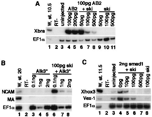Figure 2 Ski antagonizes BMP signaling in Xenopus explants. (A) Ski blocks BMP2 activity. Explants were cultured until stage 10.5 and analyzed for Xbra expression by RT-PCR. Lanes 1 and 2, whole embryo control and no RT (RTâ); lane 3, uninjected explants; lanes 4 and 5, explants expressing AB2; lanes 6â8, explants expressing AB2 with increasing amounts of ski mRNA; lanes 9â11, explants expressing ski mRNA only. (B) Ski fails to neuralize in the presence of high levels of the constitutive active BMPRI (Alk3*). Explants were analyzed at stage 20 for NCAM expression. Lanes 3â5, explants expressing AB2 mRNA only; lane 6â8, explants expressing ski and increasing amounts of Alk3* as indicated. Alk3*, (Q233D)Alk3. (C) Ski blocks the activity of Smad1. Lane 3, uninjected sample; lane 4, Smad1 stimulates the expression of the ventral markers, Xvex-1 and Xhox-3; lanes 5â7, explants expressing Smad1 mRNA in combination with increasing amounts of ski mRNA; Lane 8, ski alone.