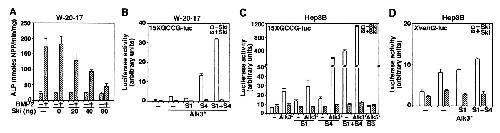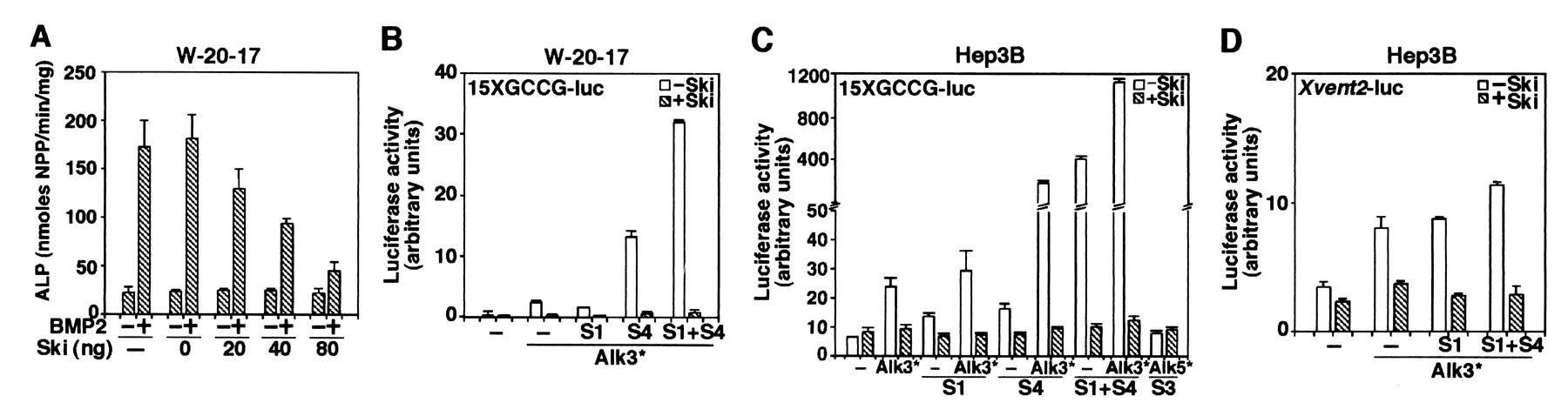 Figure 3 Ski represses BMP signaling in mammalian cells. (A) Ski inhibits BMP-induced ALP in W-20-17 cells. W-20-17 cells plated in a 96-well cluster were transfected with increasing amounts of c-ski as indicated. Twenty-four hours after transfection, the cells were treated with 250 ng/ml BMP2 for 40 h. ALP was measured by an Elisa reader and expressed as p-nitrophenol produced in nmol/min per mg protein. Ski represses BMP-induced transcriptional activation in W-20-17 (B) and Hep3B (C and D) cells. W-20-17 and Hep3B cells were cotransfected with 0.75 μg of 15xGCCG-Luc (B and C) or Xvent2-Luc (D), 0.5 μg of constitutive active type I receptors (Alk3* or Alk5*), 0.75 μg of ski, and 0.15 μg of Smads. Luciferase activity was measured 48 h later. Alk3*, (Q233D)Alk3; Alk5*, (T204D)Alk5; S1, Smad1; S4, Smad4.