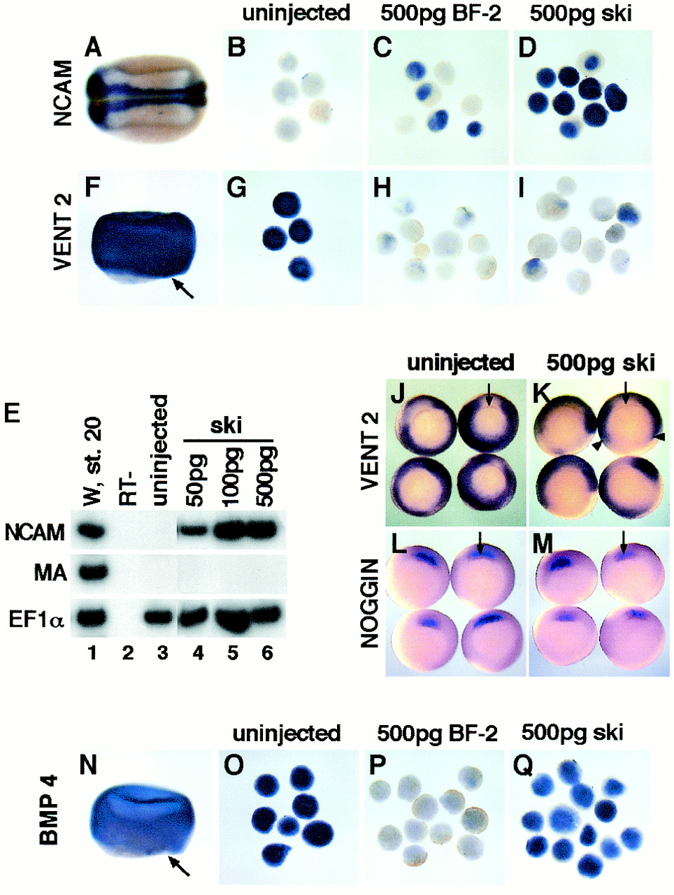 Figure 1 (AâE) Human ski neuralizes Xenopus ectoderm. Explants were cultured until stage 20 for analysis of NCAM expression. (A) Embryos express NCAM only in the central nervous system. Anterior is to the left and dorsal is to the top. (B) Uninjected explants. (C) Explants expressing 500 pg of BF-2 mRNA. (D) Explants expressing 500 pg of human ski mRNA. (E) RT-PCR analysis. Lanes 1 and 2, whole embryo control (stage 20) followed by the RT minus negative control; lane 3, uninjected explants; lanes 4â6, explants injected with increasing amounts of ski mRNA. The elongation factor 1 alpha (EF1α) primers were used to determine RNA recovery. Primers for muscle actin were used to assess mesoderm development. W, whole embryo; RTâ, no RT. (FâI) Ski inhibits Xvent2 expression in ectoderm. Ectodermal explants were cultured until the midgastrula stage (stage 10.5). (F) In the embryo, Xvent2 is expressed in the animal cap and the marginal zone (dorsal lip is indicated by the arrow). (G) Uninjected explants. (H) Explants expressing 500 pg of BF-2 mRNA. (I) Explants expressing 500 pg of ski mRNA. (JâM) Ski inhibits Xvent2 expression in the embryo. (J) Control embryos (ventral view) showing Xvent2 expression in the marginal zone (stage 10.5). (K) Embryos injected with 500 pg of ski mRNA; arrowheads point to where Xvent2 expression is inhibited. (L) Control embryos probed for noggin expression. (M) Embryos injected with 500 pg of ski mRNA probed for noggin expression. (NâQ) Ski does not inhibit BMP4 expression in the ectoderm. Explants were cultured until the midgastrula stage (stage 10.5). (N) In the embryo, BMP4 is expressed strongly in the ectoderm and the marginal zone (dorsal lip is indicated by the arrow). (O) Uninjected ectodermal explants. (P) Explants expressing 500 pg of BF-2. (Q) Explants expressing 500 pg of ski.
