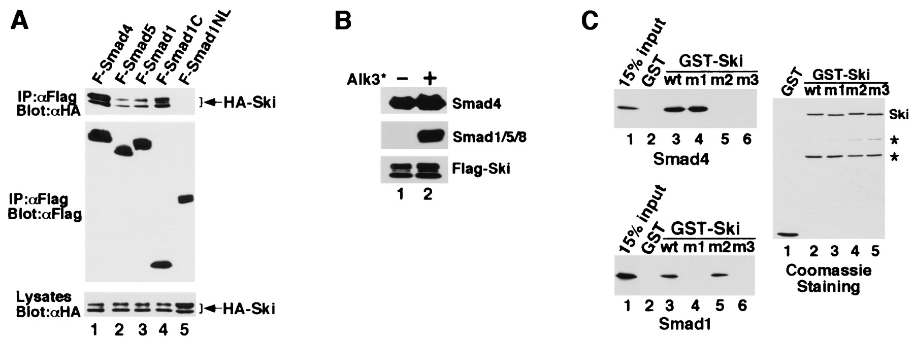 Figure 4 Ski interacts with Smad1 and Smad5. (A) Flag-tagged full-length or truncated Smad proteins were cotransfected into 293T cells together with HA-tagged Ski. The Smad-bound Ski was isolated by immunoprecipitation with anti-Flag M2 mAb and detected by Western blotting with an anti-HA mAb. Cell lysates were blotted directly as a control for HA-ski expression. (B) Ski associated with endogenous Smad1 and Smad4 in W-20-17 cells. W-20-17 cells were transfected with Flag-Ski together with or without the constitutively active type I BMP receptor. Ski-associated Smad complex was isolated by immunoprecipitation with anti-Flag agarose and detected by immunoblotting with an anti-Smad1 (T-20) or anti-Smad4 (C-20) antibody. (C) Ski binds to Smad1 directly in vitro. GST-Ski immobilized on glutathione-Sepharose was incubated with purified recombinant Smad1 or Smad4 as described in Materials and Methods. The Ski-bound Smads were eluted by glutathione and detected by immunoblotting with anti-Smad1 or anti-Smad4. GST alone was used as negative control. The amounts of wild-type or mutant GST-Ski used in the binding assay were shown by Coomassie staining. * indicates nonspecific background bands.