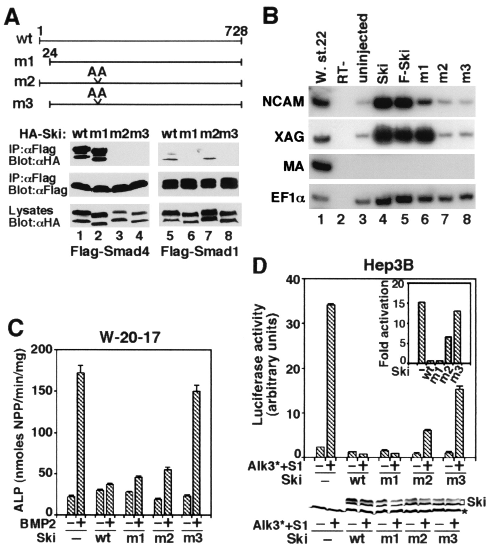 Figure 5 Interactions between Ski and the Smads are required for repression of BMP signaling by Ski. (A) Interaction between mutant Ski proteins and the Smads. (Upper) Schematic drawings of the Ski mutants are shown. (Lower) HA-tagged, wild-type, or mutant Ski proteins were cotransfected into 293T cells together with Flag-tagged Smad1 or Smad4 as indicated. The Smad-bound Ski proteins were isolated by immunoprecipitation with anti-Flag M2 mAb and detected by Western blotting with an anti-HA mAb. Cell lysates were blotted directly as a control for HA-Ski expression. (B) Mutant analysis in Xenopus ectoderm. Explants were harvested at stage 22 and assayed for NCAM, XAG, and muscle actin expression. Lanes 1 and 2, whole embryo and no RT (RTâ) control; lane 3, uninjected sample; lanes 4 and 5, explants expressing 500 pg of wild-type ski mRNA; lanes 6â8, explants expressing 500 pg of mRNA of ski mutants m1, m2, or m3. (C) To test the ability of the Ski mutants to repress BMP-induced ALP activity, various ski mutants were transfected into W-20-17 cells. ALP activity was assayed as described in Materials and Methods. (D). Hep3B cells were cotransfected with 0.75 μg of 15xGCCG-Luc, 0.5 μg of constitutive active BMPRI (Alk3*), 0.75 μg of HA-tagged, wild-type, or mutant ski, and 0.15 μg of Smads. Luciferase activity was measured 48 h later. (Lower) The levels of Ski proteins present in the transfected cells were detected by Western blotting with the anti-HA antibody. * indicates a nonspecific background band.