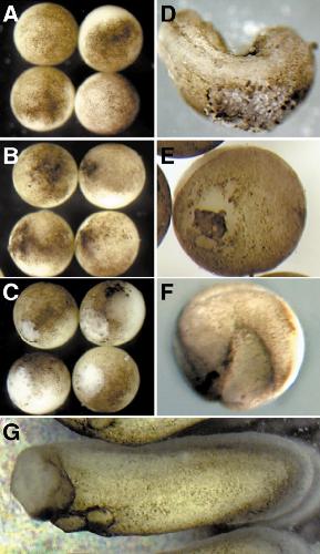 Fig. 4. Apoptosis, epithelial disruptions, and edema. (A) Unin- jected control, stage 10. (B) Embryo injected with clone 19N22 (vex-1) begins to show the mottled phenotype characteristic of apoptosis. (C) Embryo injected with 19K13 (similar to caspase-2) shows more severe apoptosis. (D) At later stages (here, st. 23), the dead cells are extruded into the vitelline space. Once the embryo hatches out, these cells will fall off and the embryo will look morphologically normal. This embryo was injected with 10A7b (similar to trip-7). (E) Embryos injected with 118B6A (similar to xepsin) show an epidermal defect. (F, G) Embryos injected with 101J13 (Rac-1) display ventral edema. (F) Stage 20. (G) Stage 28. Note that at later stages the fluid-filled sac has regressed.