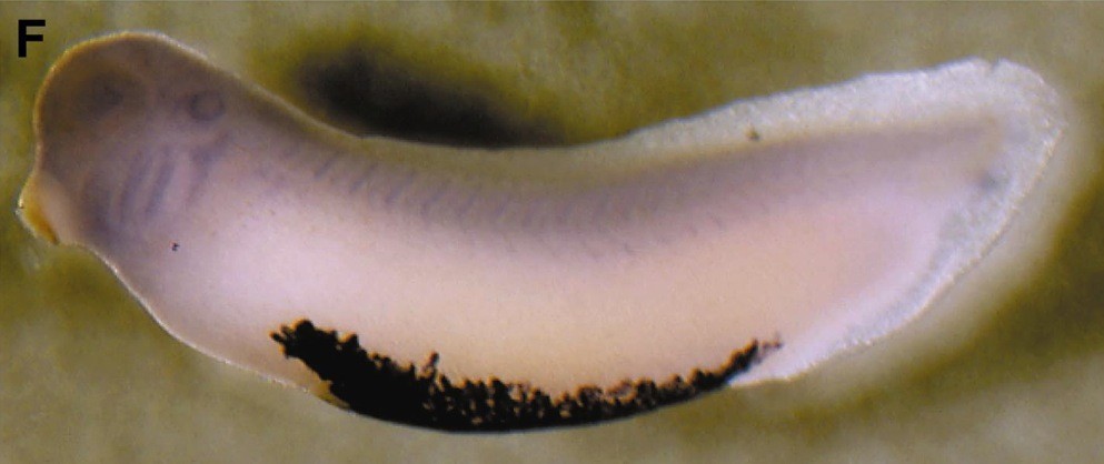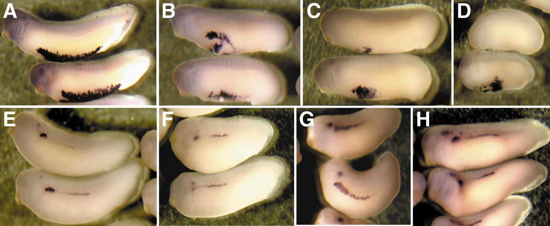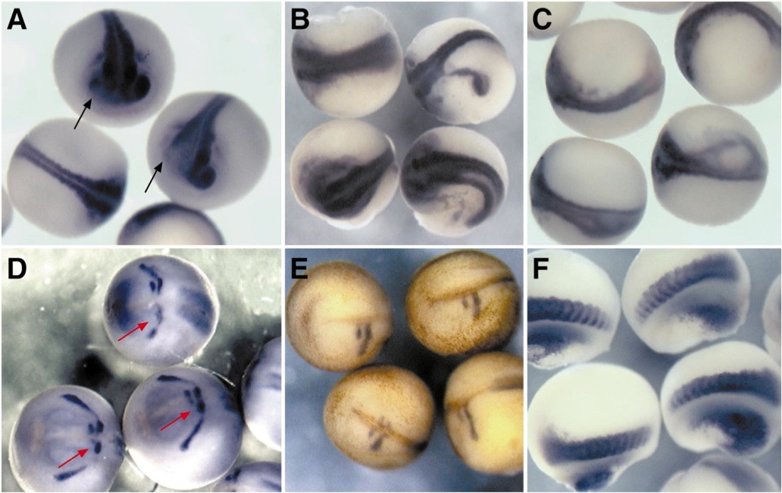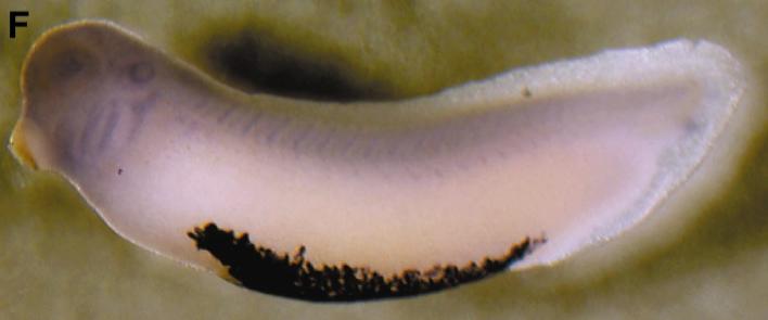 Fig 3. Secondary axis, anterior defect, and ectopic pigmentation. (A) 77E19 (ï°-catenin) induces a complete secondary axis. Ectopic cement gland marked with red arrow, normal cement gland marked with white arrowhead. (B) Clone 31N15 (Wnt-7b) also induces a complete secondary axis. This embryo has been stained with MyoD. (C) Embryo injected with clone 81C8A/81E10C (similar to KIAA0058) displays anterior defects. (D) Injection with 2H23 (Sox-2). This embryo shows ectopic pigmentation continuous with the cement gland (red arrowhead). (E) Uninjected control. (F) Embryo injected with 17J10 (Forkhead-2) shows ectopic pigmentation.