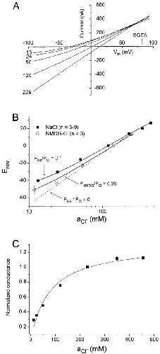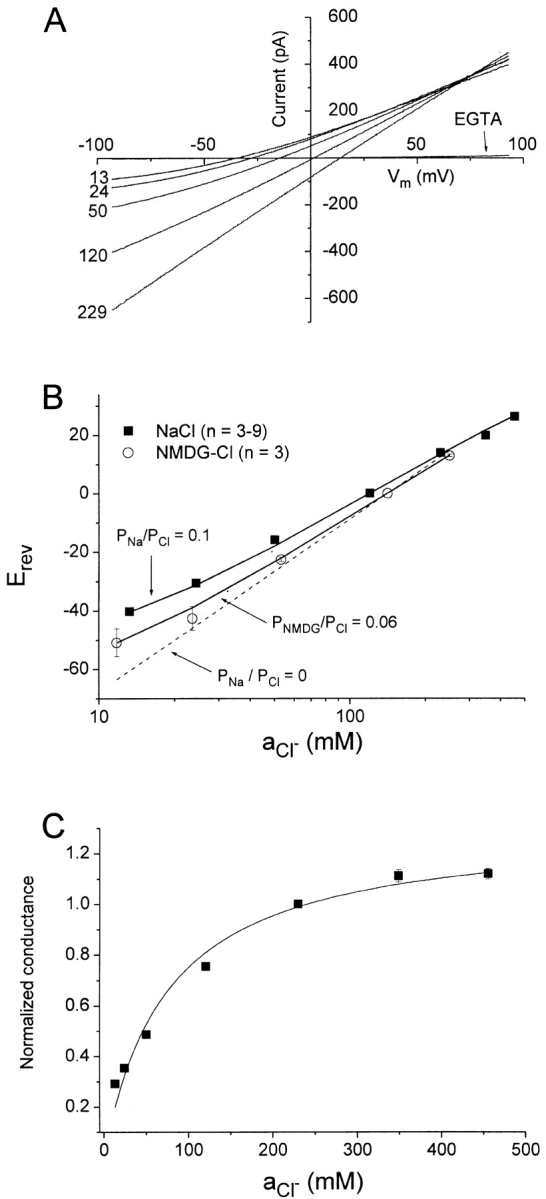 Figure 1. Sodium permeability and Cl affinity of ICl.Ca. An inside-out excised patch from a Xenopus oocyte was exposed to different cytoplasmic [NaCl] concentrations and the I–V relationship determined by 250-ms duration voltage ramp from −100 to +100 mV. (A) I–V curves. The external (pipet) solution contained 150 mM NaCl, 10 mM HEPES, 0.1 mM CaCl2, pH 7.2. The cytoplasmic (bath) solution contained the same solution except that the NaCl concentration was varied. The osmolarity of each solution was adjusted to 665 mOsM by addition of sucrose, except for the 350- and 460-mM solutions, which had higher osmolarities and contained no sucrose. The Cl activities (aCl) measured by Cl-sensitive electrodes are indicated at the left end of each I–V curve. The I–V curve labeled EGTA was obtained in symmetrical 150-mM NaCl solutions, except that Ca2+ in the cytoplasmic solution was omitted and 10 mM Na2EGTA, pH 7.2, was added. (B) Change in Erev as a function of aCl. The reversal potentials from experiments shown in A were corrected for liquid junction potentials. (Solid squares) NaCl solutions. Each data point is the mean of three to nine patches. The heavy solid line is calculated from the Goldman-Hodgkin-Katz equation (ΔErev = 25.7 · ln[(Nao +Cli · PCl/PNa)/(Nai + Clo · PCl/PNa)]) with PNa/PCl = 0.1. (Open squares) NMDG-Cl solutions; n = 3. Thin line is calculated from the Goldman-Hodgkin-Katz equation with PNMDG/PCl = 0.06. The dashed line is calculated assuming that the channel is selectively permeable only to Cl. (C) Affinity of the channel for Cl. The chord conductance was measured from I–V curves between Erev and Erev − 50 mV and plotted versus aCl. The line is a fit to the equation G = Gmax · aCl / Kd + aCl, with an apparent Kd for Cl of 73 mM.