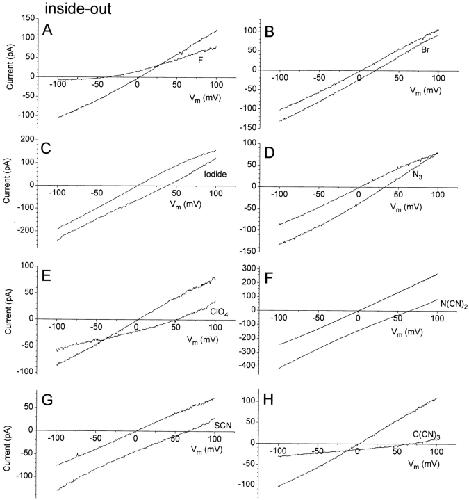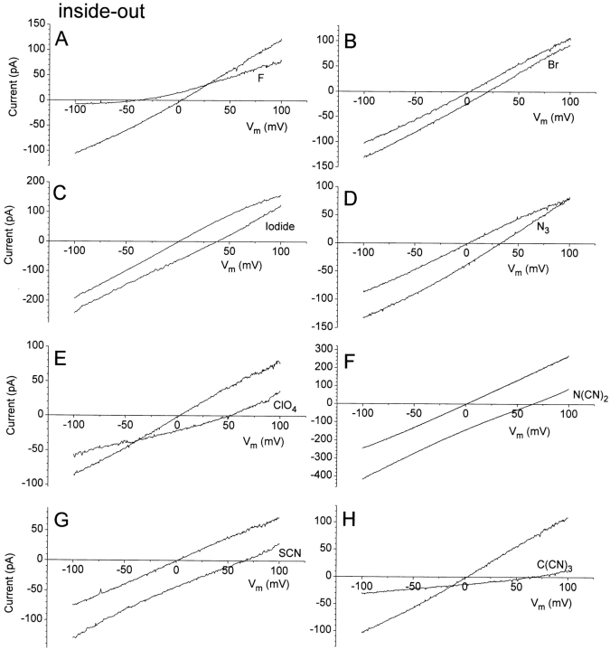 Figure 2. I–V relationships of ICl.Ca in inside-out patches with different cytoplasmic anions. The external solution contained 150 mM NaCl, 10 mM TES, pH 7.2, and 0.1 mM CaCl2. The cytoplasmic solution was shifted between this solution (unlabeled traces) and 150 mM NaX, 10 mM TES, pH 7.2, 0.1 mM CaCl2, where X is the substitute anion (labeled traces). The traces have not been corrected for liquid junction potentials. (A) Fluoride; (B) bromide; (C) iodide; (D) azide; (E) perchlorate; (F) dicyanamide; (G) thiocyanate; and (H) tricyanomethanide (potassium salt). The I–V curves were obtained by voltage ramps from −100 to +100 mV.