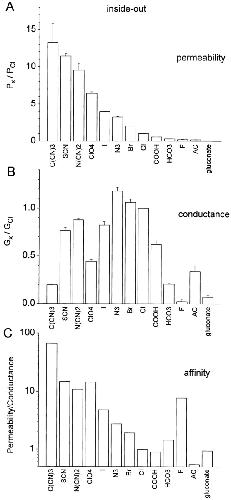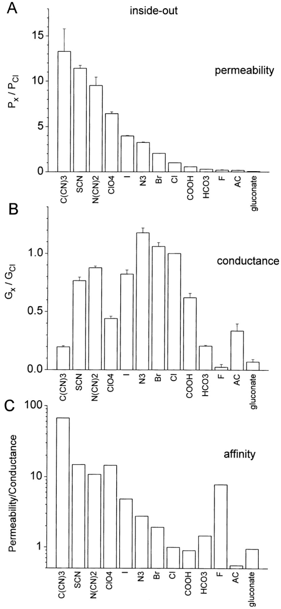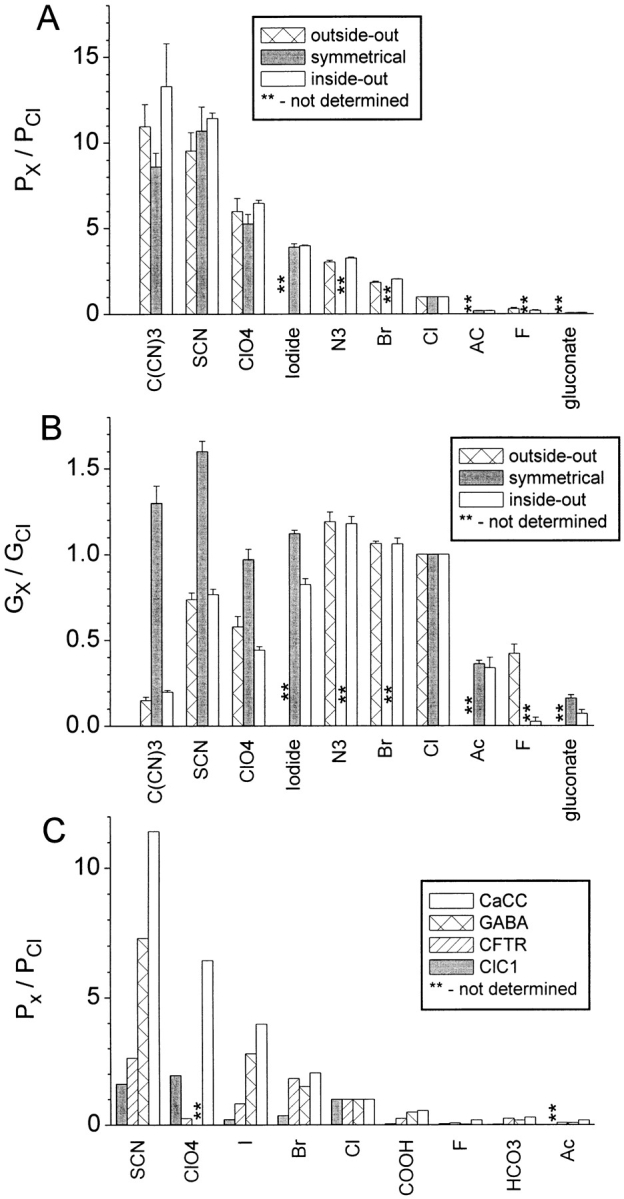 Figure 5. Comparison of permeabilities and conductances. (A) Relative permeabilities. (B) Relative conductances. (Open bars) Inside-out patches with changes in cytoplasmic solution (n = 3–5). (Cross-hatched bars) Outside-out patches with changes in external solution (n = 3–4). (Closed bars) Inside-out patches with substitute anion on both sides of the membrane was compared with Cl on the cytoplasmic side (n = 3–6). (C) Comparison of Px/PCl in different anion channels. ClCaC (open bars; data from this paper); GABAA receptor (cross-hatched bars; data from Bormann et al. 1987); CFTR (slant-hatched bars; data from Linsdell and Hanrahan 1998); and ClC-1 (closed bar; data from Rychkov et al. 1998).