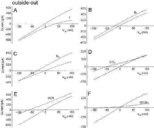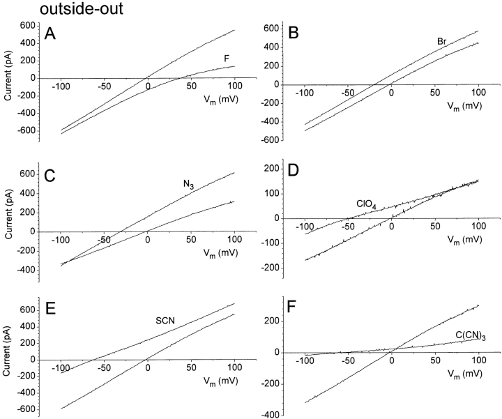 Figure 4. I–V relationships of ICl.Ca in outside-out patches with different external anions. The conditions were the same as Fig. 2, except that the patch was outside-out. (A) Fluoride; (B) bromide; (C) azide; (D) perchlorate; (E) thiocyanate; and (F) tricyanomethanide.