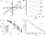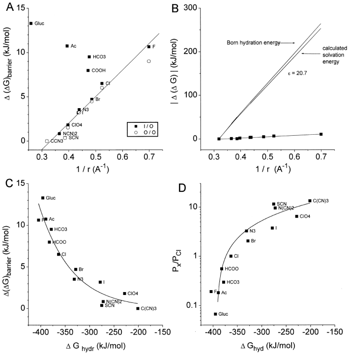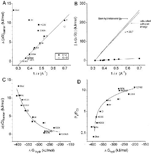 Figure 6. Analysis of anion permeation through ClCaC channels. (A) The relative energy barrier height (Δ(ΔG)barrier) was calculated from the permeabilities relative to C(CN)3 in Fig. 5 using . Δ(ΔG)barrier was plotted versus the reciprocal of the ionic radius of the anion after applying the Lattimer correction (Smith et al. 1999). (Closed squares) Inside-out patches; (open circles) outside-out patches. The line is the best fit to the data points excluding gluconate, acetate, bicarbonate, and formate. (B) Calculation of the effective dielectric constant of the pore. The relative Born hydration energy in water (heavy solid line) was calculated from with ɛ = 80 (water). The line (Δ(ΔG)barrier) through the data points is from A. Relative solvation energy (thin line) was calculated by subtracting the fit to the data points from the heavy line. (C) Δ(ΔG)barrier versus measured free energies of hydration. Hydration free energies were obtained from Marcus 1997 or were extrapolated from potentiometric measurements (Smith et al. 1999). (D) Relative permeabilities versus hydration free energy.