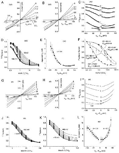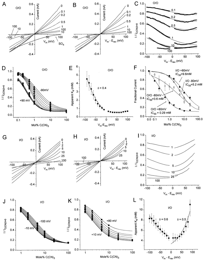 Figure 7. ICl.Ca block by C(CN)3. (A–E) Outside-out patch with C(CN)3 on the extracellular face. (G–L) Inside-out patch with C(CN)3 on the cytoplasmic side. The bath solutions contained 10 mM TES, pH 7.2, 0.1 mM CaCl2, and 150-mM mixtures of NaCl and KC(CN)3. The pipet contained the same solution with 150 mM NaCl. The patch was voltage-clamped with a 250-ms duration voltage ramp from −100 to +100 mV. (A) I–V relationships in outside-out patches with the following external mol% C(CN)3 (the balance being Cl) as marked: 0, 0.1, 0.2, 0.5, 1, 10, and 100. The line marked “SO4” is the I–V curve obtained with Cl replaced with SO4 on the external side to evaluate leak. (B) The I–V curves in A were replotted versus the driving force (Vm− Erev) for each anion mixture. (C) Voltage-dependent block of ICl.Ca by C(CN)3. (Heavy lines) Each curve in B was divided by the curve obtained in 100 mol% Cl. (Light lines) Fit of the data to (see text). (D) Concentration- and voltage-dependent block of ICl.Ca. The data in C were replotted for various potentials as a function of mol% C(CN)3. The data were fitted to the logistic equation: I/IC(CN)3 = 0 = Imin + {(Imax – Imin) / 1 +([C(CN)3] /Kd)n} (solid lines). (E) Apparent Kd of extracellular C(CN)3 as a function of voltage. The apparent Kd at each voltage was determined from the fits in D in four separate experiments and averaged. (F) Inhibition of the current in both inside-out and outside-out patches as a function of mol% C(CN)3. The current was measured at +80 and −80 mV of driving force. The current relative to that in 100% Cl was plotted versus [C(CN)3]. (Squares) Outside-out patches; (circles) inside-out patches; (open symbols) −80 mV; and (closed symbols) +80 mV. (G) I–V relationships for inside-out patches with the following cytoplasmic mol% C(CN)3 (the balance being Cl) as marked: 0, 1, 2, 5, 10, 25, and 100. (H) The I–V curves in G were replotted versus the driving force (Vm− Erev) for each anion mixture. (I) Voltage-dependent block of ICl.Ca by C(CN)3. Each curve in H was divided by the curve obtained in 100 mol% Cl. (J and K) Concentration- and voltage-dependent block of ICl.Ca. The data in I were replotted for various potentials as a function of mol% C(CN)3. The data were fitted to the logistic equation (solid lines). (L) Apparent Kd of cytoplasmic C(CN)3 as a function of voltage. The apparent Kd at each voltage was determined from the fits in J and K for four separate experiments and averaged.