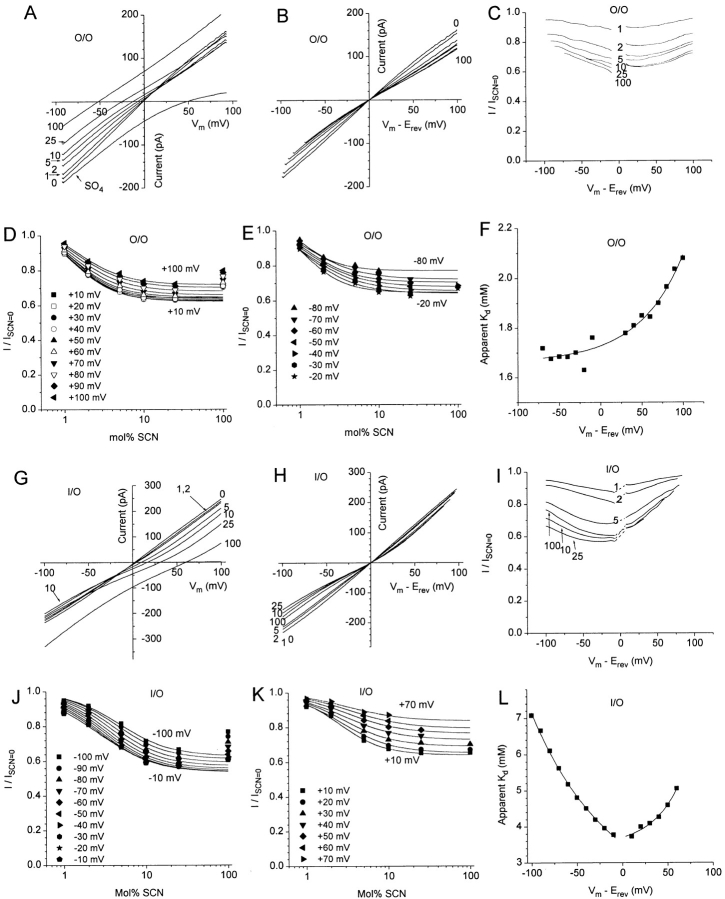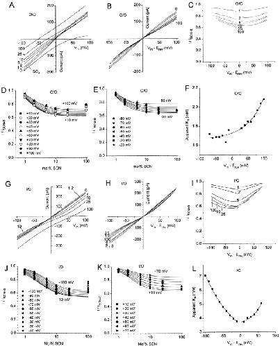 Figure 8. ICl.Ca block by SCN. (AâF) Outside-out patch with SCN on the extracellular face. (GâL) Inside-out patch with SCN on the cytoplasmic side. Bath solutions contained 10 mM TES pH 7.2, 0.1 mM CaCl2, and 150-mM mixtures of NaCl and NaSCN. The pipet contained the same solution with 150 mM NaCl. The patch was voltage-clamped with a 250-ms duration voltage ramp from â100 to +100 mV. (A) IâV relationships with the following external mol% SCN (the balance being Cl) as marked: 0, 1, 2, 5, 10, 25, and 100. (B) The IâV curves in A were replotted versus the driving force (Vmâ Erev) for each anion mixture. (C) Voltage-dependent block of ICl.Ca by external SCN. Each curve in B was divided by the curve obtained in 100 mol% Cl. (D and E) Concentration- and voltage-dependent block of ICl.Ca. The data in C were replotted for various potentials as a function of mol% SCN. The data were fitted to the logistic equation (solid lines). In D, the data points at 100 mol% SCN were ignored in fitting the curves. This experiment is representative of three experiments. (F) Apparent Kd of extracellular SCN as a function of voltage. The apparent Kd at each voltage was determined from the fits in D and E. (G) IâV relationships with the following cytoplasmic mol% SCN (the balance being Cl) as marked: 0, 1, 2, 5, 10, 25, and 100. (H) The IâV curves in G were replotted versus the driving force (Vmâ Erev) for each anion mixture. (I) Voltage-dependent block of ICl.Ca by cytoplasmic SCN. Each curve in H was divided by the curve obtained in 100 mol% Cl. (J and K) Concentration- and voltage-dependent block of ICl.Ca. The data in I were replotted for various potentials as a function of mol% SCN. The data were fitted to the logistic equation (solid lines). In J, the data points at 100 mol% SCN were ignored in fitting the curves. This experiment is representative of five experiments. (L) Apparent Kd of cytoplasmic SCN as a function of voltage. The apparent Kd at each voltage was determined from the fits in J and K.