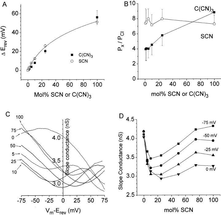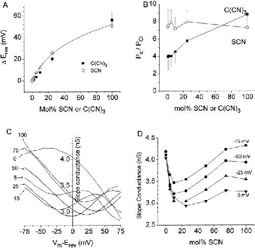 Figure 9. Anomalous mole fraction behavior of ClCaCs. (A) Dependence of Erev on mol% C(CN)3 or SCN. The Erevs corrected for liquid junction potential obtained from experiments such as those in Fig. 7 and Fig. 8 were plotted versus mol% of the substitute anion. (Open symbols) SCN, n = 5; (closed symbols) C(CN)3, n = 4. (Solid line) Goldman-Hodgkin-Katz equation with PSCN/PCl = 8. (B) Dependence of permeability ratio on mol% of SCN or C(CN)3. Px/PCl was calculated from the data in A from the form of the Goldman-Hodgkin-Katz equation: Px/PCl = [Clo · (exp (F/RT · ÎErev) â 1) / Xi] +1, where Clo = 150 mM and Xi is the concentration of the substitute anion. (C) Dependence of slope conductance on driving force at different mol% SCN. The slope conductance was determined by calculating the slope of the IâV curve of an inside-out patch like the one in Fig. 8 using a 20-mV moving window. The resulting curves were smoothed by the FFT smoothing algorithm in Origin and the slope conductance was plotted versus the driving force for different mol% SCN (labels to left of curves). (D) Slope conductance versus mol% SCN. The slope conductance for four different voltages in C was plotted versus mol% SCN. The curves show a minimum slope conductance at 10â25 mol% SCN.