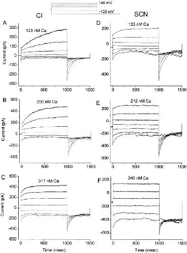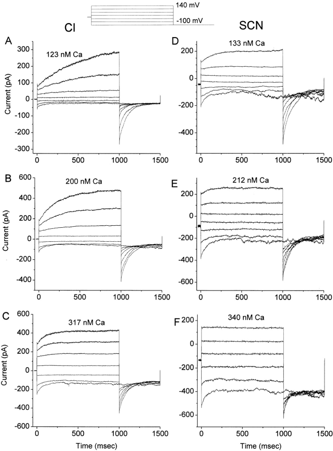 Figure 10. Current traces of ICl.Ca in low free [Ca2+] with Cl or SCN as permeant anion. All traces are from the same patch. Inside-out excised patches were voltage-clamped in symmetrical 150 mM NaCl (AâC) or with 150 mM NaSCN on the cytoplasmic side and 150 mM NaCl on the external side (DâF). The solutions also contained 10 mM TES, pH 7.2, and 10 mM EGTA plus Ca-EGTA, as described in materials and methods, to adjust the free [Ca2+] to the concentrations indicated on the cytoplasmic side. Ca2+ concentrations were measured by Fura-2 fluorescence. The patches were clamped from a holding potential of 0 mV to potentials between +140 and â100 mV for 1 s, followed by a 500-ms pulse to â100 mV. These traces are typical of four experiments.
