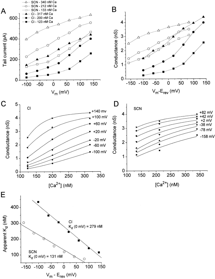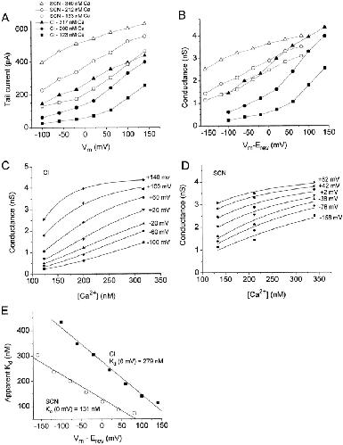 Figure 11. Calcium dependence of ICl.Ca with Cl or SCN as permeant anion. (A) Tail currents versus voltage. The instantaneous tail currents at â100 mV in Fig. 10 were plotted versus voltage for each condition (open symbols, SCN; closed symbols, Cl; [Ca2+] as indicated). (B) Conductance versus voltage. The conductance of the traces in Fig. 10 was determined by measuring the amplitudes of the instantaneous tail currents at â100 mV and dividing by the driving force (Vmâ Erev). Erev was shifted +58 mV in SCN compared with Cl. (C) Conductance versus free [Ca2+] at various potentials with Cl as permeant anion. The data were fitted to the Boltzmann equation: G = Gmin â [(Gmax â Gmin) / 1 + e([Ca]âKd)/s], where Gmax and Gmin are the maximum and minimum conductances, respectively, and s is the slope factor. Gmax was fixed at 4.46 nS for Cl and 4.54 nS for SCN, and Gmin was fixed at 0. Gmax was chosen by preliminary fitting sessions using the data from the most positive potentials and allowing all variables to float. Our previous extensive study on the voltage dependence of ICl.Ca (Kuruma and Hartzell 2000) justified using the same Gmax for all voltages. Because of problems with rundown of ICl.Ca in excised patches (Kuruma and Hartzell 2000), we were able to test only a limited number of [Ca2+] before rundown exceeded 10%. This limited the number of data points we had available for fitting. (D) Conductance versus free [Ca2+] at various potentials with SCN as the permeant anion. (E) Apparent Kd for Ca2+ is different in the presence of Cl and SCN. The apparent Kd was extracted from the Boltzmann fits in C and D and plotted versus membrane potential. These data are typical of four experiments.