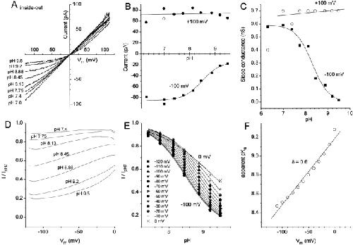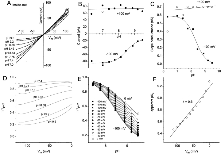 Figure 12. Dependence of ICl.Ca on cytoplasmic pH. An inside-out patch was exposed to bath solutions composed of 150 mM NaCl, 0.1 mM CaCl2, and 10 mM HEPES, adjusted to pH between 6.3 and 9.5 with NaOH. The pipet contained the same solution at pH 7.0. The patch was voltage-clamped by a ramp from −120 to +120 mV. (A) I–V relationship for pH 7.0, 7.4, 7.75, 8.13, 8.45, 8.88, 9.2, and 9.5. (B) Amplitude of the current at +100 mV (circles) and −100 mV (squares) for the traces shown in A and also pH 6.3. (C) Slope conductance measured between −100 and −120 mV (closed squares) or between +100 and +120 mV (open circles). (D) Voltage dependence of pH block. The currents at each pH in A were divided by the current at pH 7.0 and plotted versus membrane potential. (E) pH- and voltage-dependent block of ICl.Ca. The data in D was replotted versus pH. (F) Apparent pKa versus Vm. The apparent pKa of current block was determined from the fits to the data in E and plotted versus membrane potential. This experiment is typical of eight experiments.