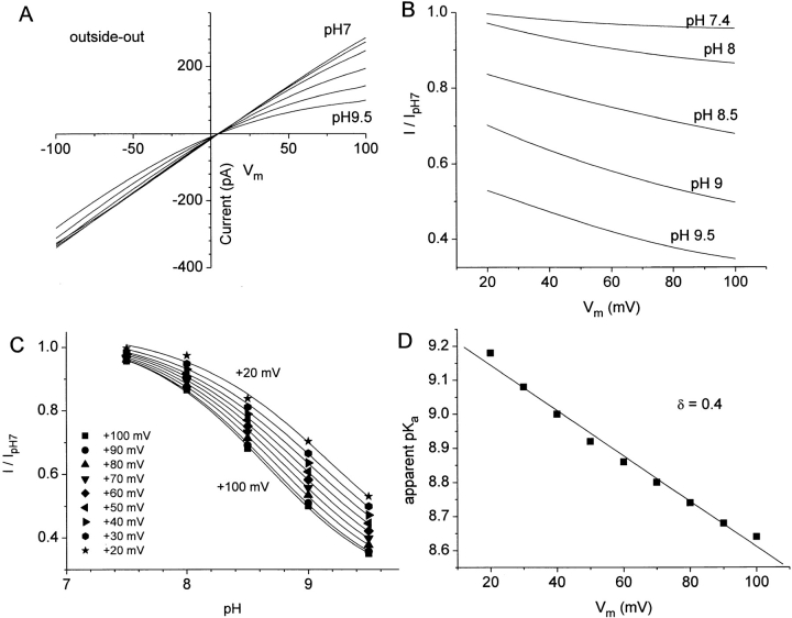 Figure 13. Dependence of ICl.Ca on external pH. An outside-out patch was exposed to bath solutions composed of 150 mM NaCl, 0.1 mM CaCl2, 10 mM HEPES, adjusted to pH between 7.0 and 9.5 with NaOH. The pipet contained the same solution at pH 7.0. The patch was voltage-clamped by a ramp from −120 to +120 mV. (A) I–V relationship for pH 7.0, 7.4, 8, 8.5, 9, and 9.5. (B) Voltage dependence of pH block. The currents at each pH in A were divided by the current at pH 7.0 and plotted versus membrane potential. (C) pH- and voltage-dependent block of ICl.Ca. The data in B was replotted versus pH. (D) Apparent pKa versus Vm. The apparent pKa of current block was determined from the fits to the data in C and plotted versus membrane potential. This experiment is one of two experiments in outside-out configuration and four inside-out experiments in which the solution inside the patch pipet was changed.