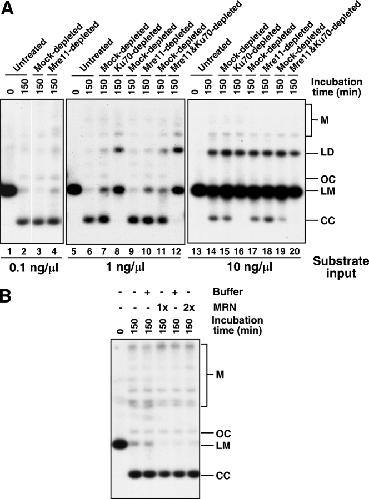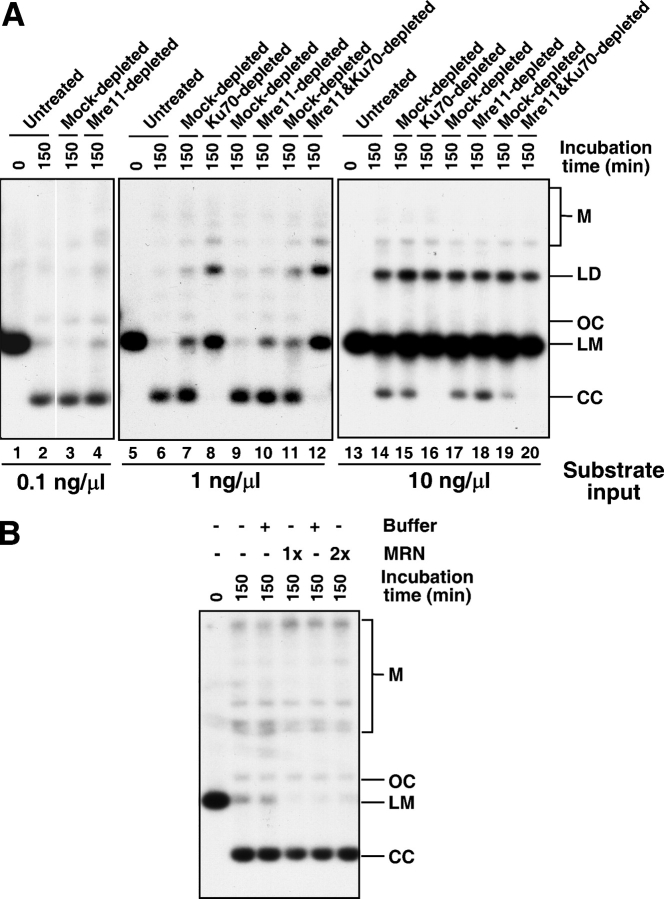 Figure 3. Mre11 depletion does not affect NHEJ-mediated generation of multimers. (A) Southern blot analysis of NHEJ products generated by incubation of blunt end + 5′-PSS substrate in the indicated depleted egg cytosol extracts at a substrate input concentration of 0.1 (left), 1 (middle), or 10 (right) ng/μl. Data in the left panel are derived from two segments of the same gel (as indicated by the dividing line). (B) Blunt end + 5′-PSS substrate was incubated at 1 ng/μl in untreated egg cytosol that had been supplemented with the recombinant MRN complex, and NHEJ products were analyzed by Southern blot hybridization. M, higher multimer forms; LD, linear dimer; LM, linear monomer (substrate); CC, closed circle; OC, open circle.