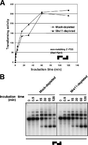 Figure 4. NHEJ kinetics is not affected by Mre11 depletion. Nonmatching 3′-PSS substrate SacI-KpnI was incubated in mock- and Mre11-depleted membrane-free cytosol, and samples were taken at the indicated time points. DNA was recovered and analyzed by (A) colony formation assay and (B) Southern blot hybridization (grouping of different segments of the same gel is indicated by dividing lines).
