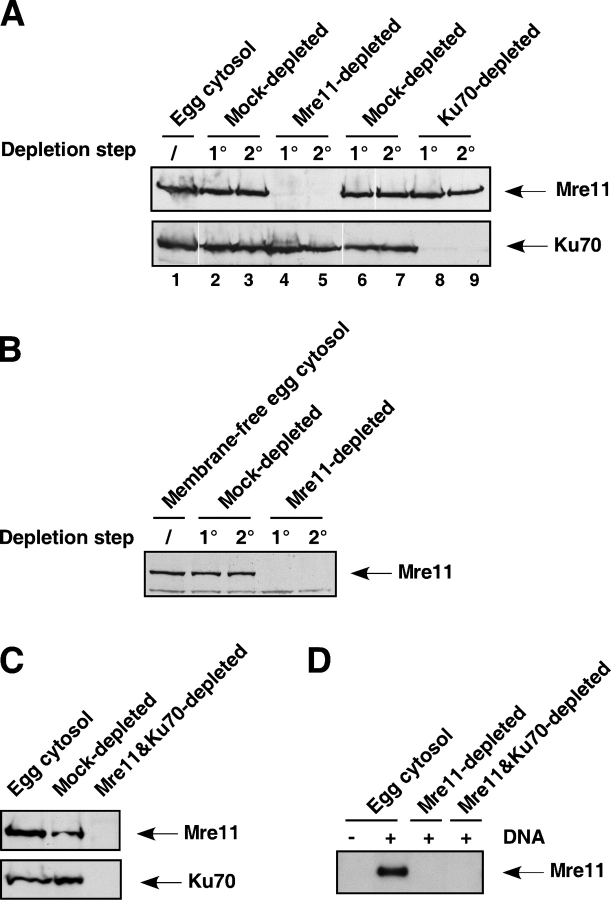 Figure 1. Immunodepletion of Mre11 and Ku70 proteins from X. laevis egg extracts. (A) Untreated egg cytosol and mock-, Mre11-, or Ku70-depleted extracts were analyzed by Western blotting with either anti-XMre11 serum or antibodies against Ku70. (B) Untreated membrane-free egg cytosol and extracts treated with preimmune (mock depleted) or anti-XMre11 serum (Mre11 depleted) were analyzed by Western blotting with anti-XMre11 serum. (C) Mre11 and Ku70 double-depleted egg cytosol (Mre11 and Ku70 depleted) were analyzed with either anti-XMre11 serum or antibodies against Ku70. (D) Untreated egg cytosol, Mre11-, or Mre11 and Ku70 double-depleted extracts were incubated with streptavidin beads coated with biotinylated, linear double-strand DNA, and the fraction of proteins bound to DNA was analyzed by Western blotting with anti-XMre11 serum.