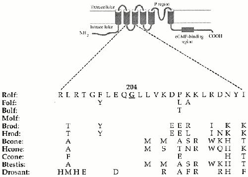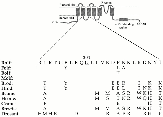 Figure 1. Amino acid sequences of the S2–S3 loop of various wild-type CNG channels. Top diagram demonstrates the primary structure and membrane topology of a CNG channel. All wild-type sequences contain a glycine residue at the site equivalent to position 204 (highlighted in bold and underlined) in the Rolf channel. Residues corresponding to the equivalent Rolf residues at positions 199–207 are very highly conserved in all channels. In contrast, there is more variation in the carboxyl-terminal half of the loop sequence. Rolf, rat olfactory; Folf, fish olfactory; Bolf, bovine olfactory; Molf, mouse olfactory; Brod, bovine rod; Hrod, human rod; Bcone, bovine cone; Hcone, human cone; Ccone, chick cone; Btestis, bovine testis; and Drosant, Drosophila antenna. The original Molf clone contained a mutation at position 204 (Molf G204E), and we mutated the glutamate (E) to the wild-type glycine (G). For the Rolf channel, the glycine at 204 was replaced with either glutamate, aspartate (D), or tryptophan (W). Replacement with a lysine residue (K) gave no functional expression.