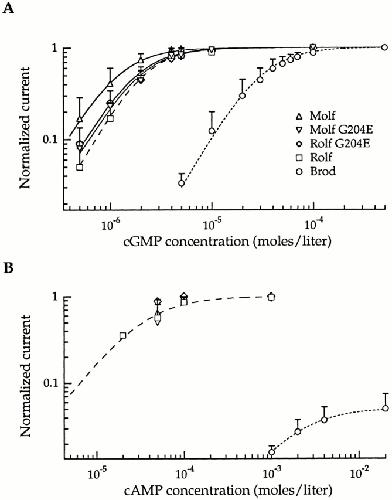 Figure 2. Sensitivities to cGMP and cAMP of Molf G204E and Rolf G204E CNG channels were similar to those of the wild-type Molf and Rolf channels. Brod and Rolf data are from the companion article (Crary et al. 2000, in this issue). Steady state, cGMP-activated currents were measured at +100 mV. (A) cGMP dose–response curves for the three wild-type channels, Molf G204E, and Rolf G204E channels. SDs are indicated by error bars. Smooth curves were drawn by fitting the averaged data with the Hill equation, I/Imax = [cNMP]n/(K1/2n + [cNMP]n), where I is the cGMP- or cAMP-activated current, Imax is the cGMP-activated current obtained at saturating cGMP, K1/2 is the concentration of cGMP or cAMP giving half-maximal activation, and n is the Hill coefficient. In fitting the data, this relation was scaled to match the measured maximal I/Imax (e.g., the maximal I/Imax for the rod channel in the presence of saturating cAMP was only 0.05 [B], rather than 1, as for saturating cGMP). The Hill relation was used only for an empirical description of the data to quantify changes in the apparent affinity and maximal activation (or inhibition; see Fig. 4 and Fig. 8); it is not meant to suggest a mechanism of channel activation or inhibition by DAG. The calculated K1/2 values were 31 μM (Brod; 11 patches), 1.2 μM (Molf; 10 patches), 2.1 μM (Rolf; 18 patches), 1.9 μM (Molf G204E; 8 patches), and 1.8 μM (Rolf G204E; 6 patches). Hill fits for Brod and Rolf channels are designated by dashed lines for emphasis. (A) Dose–response curves for activation by cAMP; the symbols are the same as those used in A. Averaged data points are shown with the SD as error bars: Brod (8 patches), Rolf (7 patches), Molf (5 patches), Rolf G204E (1 patch), and Molf G204E (4 patches). Hill fits to channel data indicate K1/2 values for activation by cAMP of 1.83 mM for Brod and 37 μM for Rolf and are represented by dashed lines. See Table for additional information.