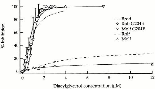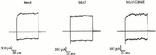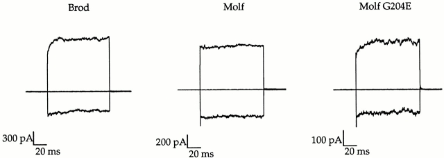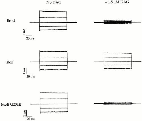 Figure 5. A glutamate at position 204 of the Molf or Rolf channel produced gating kinetics similar to those of the Brod channel. In the absence of DAG, the Molf channel has no detectable gating kinetics, whereas Molf G204E has obvious gating kinetics, much like the Brod channel. Currents were obtained with either 10 μM (Brod), 1 μM (Molf), or 1 μM (Molf G204E) cGMP in response to voltage jumps ranging from −100 to +100 mV in steps of 50 mV, from a holding potential of 0 mV. For clarity, only currents at −100, 0, and +100 mV are shown. At +100 mV, the observed currents had an I/Imax of 0.20, 0.15, and 0.15, respectively (from left to right).