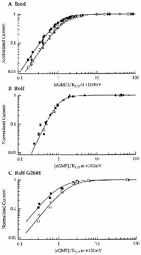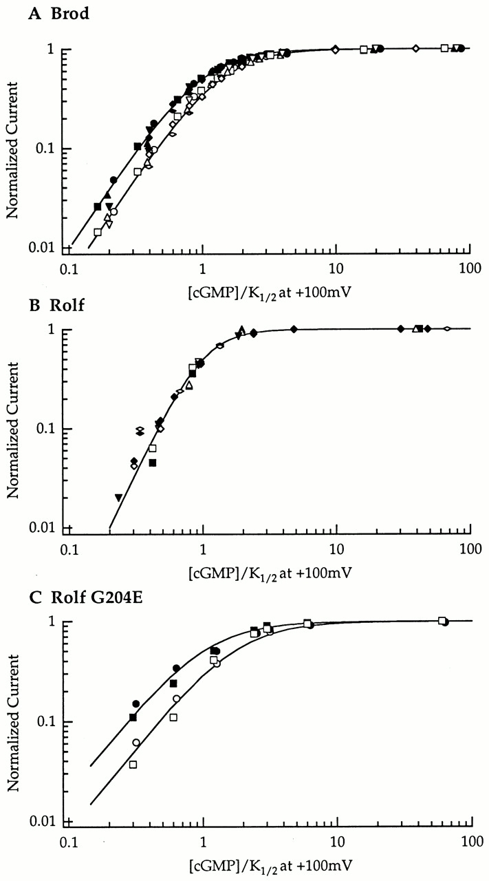Figure 6. A glutamate at position 204 of the Molf or Rolf channel produced voltage-dependent gating similar to that of the Brod channel. To analyze the data from multiple patches, the dose–response curve from each patch was fit with the Hill relation, and each set of data was normalized to the cGMP K1/2 at +100 mV for that patch. Each different symbol represents the normalized data points from a single patch; open symbols for −100 mV and closed symbols for +100 mV. All points for each voltage were re-fit with the Hill equation, setting the normalized K1/2 for +100 mV at 1.0; a change in the normalized K1/2 at −100 mV indicates voltage-dependent gating. (A) Brod channel (six patches): at +100 mV, n = 2.0; and at −100 mV, the normalized cGMP K1/2 = 1.4 and n = 2.0. (B) Rolf channel (six patches): at +100 mV, n = 2.8; and at −100 mV, the normalized cGMP K1/2 = 1.0 and n = 2.8. (C) Rolf G204E channel (2 patches): at +100 mV, n = 1.7; and at −100 mV, the normalized cGMP K1/2 = 1.7 and n = 1.7.