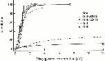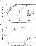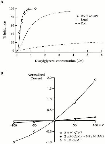 Figure 8. The Rolf G204W mutant had a slightly greater DAG sensitivity than that of the Brod channel, and its inhibition was similarly voltage-independent (compare with Fig. 4 in companion article, Crary et al. 2000, in this issue). (A) The DAG dose–response curve was measured in the presence of 2 mM cGMP: data were averaged from three patches and fit with the Hill equation. The maximum inhibition for the Rolf G204W mutant was 100% with an IC50 = 0.26 μM and n = 3.2. The Hill fits for the Brod and Rolf channels (from Fig. 4) are shown for comparison as dashed curves. (B) Steady state current–voltage relations obtained from data acquired on a single patch containing the Rolf G204W mutant. Open circles represent cGMP-activated currents at saturating concentrations in the absence of DAG. Filled circles represent currents at saturating cGMP in the presence of 0.8 μM DAG. For comparison, the triangles show the currents at lower (5 μM) cGMP concentration, without DAG.