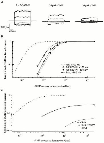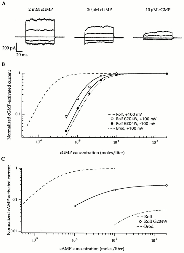 Figure 7. Introduction of tryptophan at position 204 produced a mutant Rolf channel with measurable gating kinetics, lower apparent agonist affinity, and decreased cAMP efficacy. (A) The current families were obtained with the designated amounts of cGMP in response to voltage jumps ranging from −100 to +100 mV in 50-mV steps, from a holding potential of 0 mV. The traces were corrected for leak by subtracting responses in the absence of cGMP. (B) The dose–response curves for activation by cGMP at + 100 mV and −100 mV are shown for a single patch containing the Rolf G204W mutant; the data were fit with the Hill relation, as in Fig. 2 (see legend). For this patch, at +100 mV, the cGMP K1/2 = 14 μM and n = 2.0; and at −100 mV, the cGMP K1/2 = 18 μM and n = 2.0. For averaged data from six patches, at +100 mV, the K1/2 = 14 μM and n = 1.7; and at −100 mV, the K1/2 = 19 μM and n = 1.7. The Hill fits (Fig. 2) for the cGMP dose–response curves of the Rolf and Brod channels (at +100 mV) are shown for comparison. (C) cAMP is only a partial agonist for Rolf G204W, unlike the Rolf channel (Hill fit from Fig. 2 is shown for comparison). A dose–response curve for activation by cAMP is shown for a single patch: K1/2 = 440 μM and n = 0.9. The average efficacy for two patches was 44%.