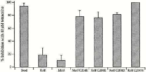 Figure 9. All mutant olfactory channels had greater sensitivity to tetracaine than did the wild-type olfactory channels. Averaged data are reported for percent inhibition at 40 μM tetracaine for Brod (3 patches), Rolf (10 patches), Molf (5 patches), Molf G204E (4 patches), Rolf G204E (4 patches), Rolf G204D (2 patches), and Rolf G204W (4 patches). SDs are indicated by error bars. Values of percent inhibition are found in Table .