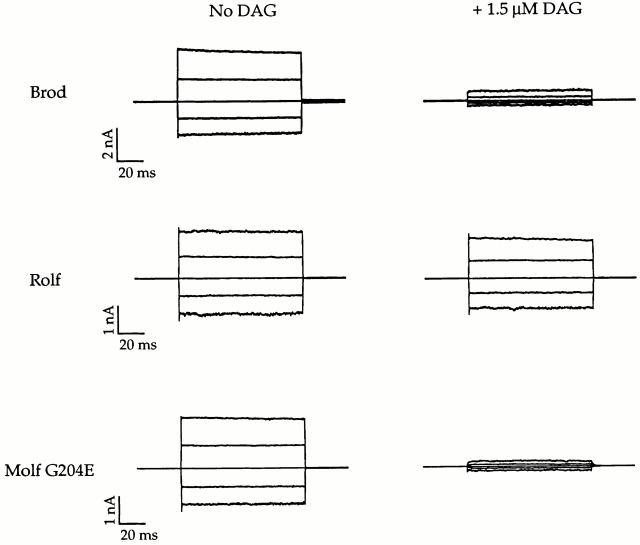 Figure 3. Current families from patches at saturating cGMP showed greater inhibition of current by DAG in Molf G204E and Brod channels than in Rolf channels. Current traces were obtained from excised, inside-out patches. Leak currents in the absence of cGMP have been subtracted. Membrane potentials were held at 0 mV and jumped in increments of 50 mV from −100 to +100 mV. The families on the left were obtained at saturating cGMP (2 mM cGMP for Brod and 100 μM for Rolf and Molf G204E), and the families on the right were obtained after the addition of 1.5 μM DAG.