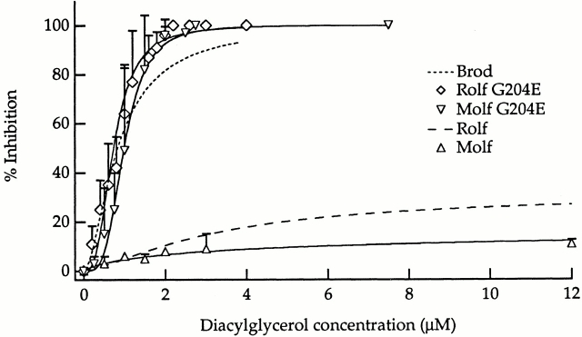 Figure 4. DAG completely suppressed saturating cGMP-activated currents of Molf G204E and Rolf G204E CNG channels, but only partially inhibited the corresponding wild-type channels at saturating agonist concentrations. Brod and Rolf data from the companion article (Crary et al. 2000, in this issue) are shown for comparison. Saturating cGMP concentrations were 2 mM for Brod channels and 100 μM for all Molf and Rolf channels. Averaged data obtained at saturating cGMP were fit with the Hill equation, IN/INmax = [DAG]n/(IC50n + [DAG]n) where IN is the percent inhibition, INmax is maximal inhibition, IC50 is the concentration of DAG required to achieve half-maximal inhibition, and n is the Hill coefficient. As for Fig. 2, the relation was scaled to reflect the measured maximal IN/INmax. For the Brod, Molf G204E, and Rolf G204E channels, the maximum inhibition was 100%. For Brod (11 patches), IC50 = 0.83 μM, and n = 1.7; for Molf G204E (12 patches), IC50 = 0.99 μM, and n = 3.6; and for Rolf G204E (5 patches), IC50 = 0.73 μM and n = 2.8. For the wild-type olfactory channels, inhibition is only partial. For Rolf (13 patches), INmax = 31%, IC50 = 3.24 μM (denoting 15.5% inhibition), and n = 1.4; and for Molf (5 patches), INmax = 17%, IC50 = 3.50 μM (denoting 8.5% inhibition), and n = 0.8. Hill fits of Brod and Rolf channels are designated by dashed lines. Error bars indicate SDs.