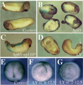 (1 ng/blastomere) by co-injection with activated p110α (p110caax, 1 ng/blastomere). In C, trunk and head but not tail development is rescued. (E-G) Vegetal views at the late gastrula stage (st. 12.5) of a control embryo (E), an embryo incubated in 80μM LY294002 between stages 9 and 12.5 (F) and an embryo incubated in 30 μM LY294002 between the two-cell stage and stage 12.5 (G). Gastrulation in embryos F and G has been severely impaired. This phenotype was fully penetrant.