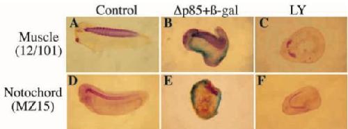 one side of the embryo only; E, radial injection). In B,E, visualisation of the β-gal positive cells (blue X-gal staining) reveals that the inhibition of muscle and notochord development is restricted to the cells that have received the exogenous mRNA. (C,F) Embryos treated with 100 μM LY2941002 from stage 9 to stage 12.5.