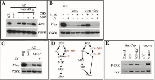 of Xbra. (F) Animal caps from control embryos or from embryos injected with mRNA for âp85 (250 pg/blastomere), p110caax (125 pg- blastomere), or a combination of both, were explanted during the blastula stages and cultured when indicated in 50 ng/ml FGF2 until the early gastrula stage and processed for RT-PCR with Xbra primers. (G) Animal caps were excised at stage 8, treated with FGF2 (50 ng/ml) alone or in combination with LY294002 (100 μM) or cycloheximide (CHX, 10 μg/ml) as indicated, and frozen at stage 10 for RT-PCR analysis of Xbra expression (top panels). In D-G, the ubiquitously expressed FGF receptor 1 gene (FGFR) is used as a loading control.