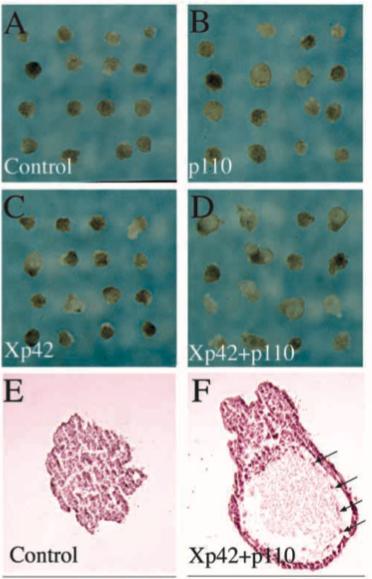 Fig. 6. Activated ERK and p110 synergise during mesoderm induction in animal caps. (A-D) Whole-mount photography of stage 37/38 animal caps explanted at stage 9 from control embryos (A), embryos injected with 250 pg of mRNA for p110caax, a membrane- targeted form of the p110α class 1A PI3K (B), embryos injected with 200 pg of mRNA for Xp42D324, an activated form of ERK (C) or embryos co-injected with both mRNAs (D). (E,F) Histological staining of sectioned animal caps at stage 37/38. (E is a control cap; the cap in F expresses activated ERK and p110α). Τhe presence of a large fluid-filled cavity lined with mesothelial cells (arrows) is characteristic of ventral mesoderm differentiation (Smith, 1993). This analysis did not reveal significant difference between the mesodermal types induced by the different mRNA injections.