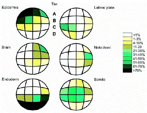 Fig. 1. Fate map adapted from Dale and Slack (1987) showing the contribution of blastomeres at the 32-cell stage to a range of tissues.