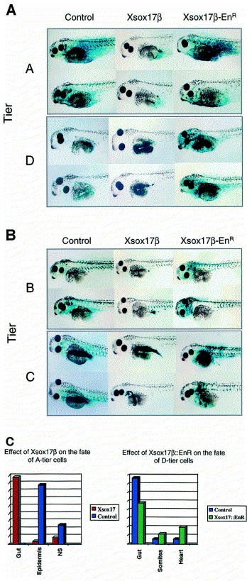 Fig. 2. (A,B) Effects of injection of Xsox17β or Xsox17β::EnR RNA, with β-galactosidase RNA, into a single blastomere (as indicated) at the 32-cell stage of embryogenesis. Tadpoles were fixed and stained for β-galactosidase expression at stage 42. At least 50 embryos were analysed for each injection; those shown are typical of the results obtained. (C) Embryos from a single experiment (n=20) were scored at stage 42 for the presence of β-galactosidase-positive cells in a range of tissues. For each embryo the proportion of such cells in each tissue was scored from igh(++++) to ow(+). These data were then converted into the histograms above (although only representative examples of tissues are shown). Although a somewhat subjective approach, data from large numbers of embryos can be represented in this way, and the results from control embryos agree well with published fate maps.